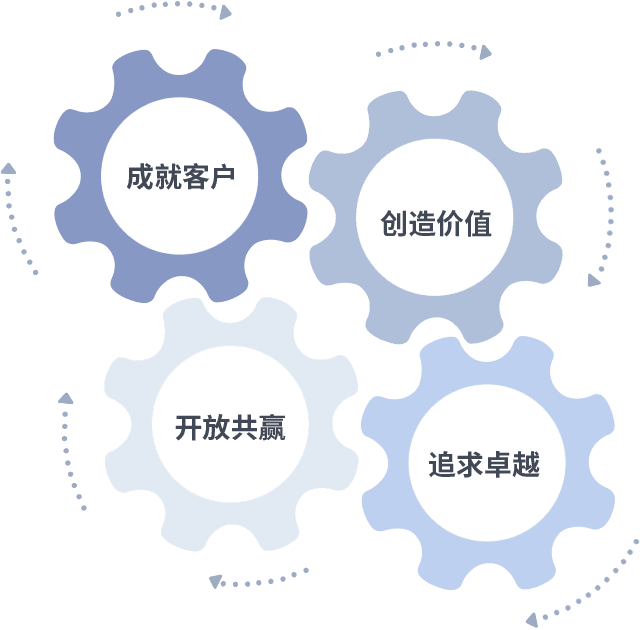 成就客户是一切决策的出发点,,,,创造价值是衡量所有工作的标准,,,追求卓越是我们做事做人的态度,,开放共赢是我们的格局也是最终的结果。。价值观的齿轮环环相扣,,推动着组织里的每个人不断向前。。