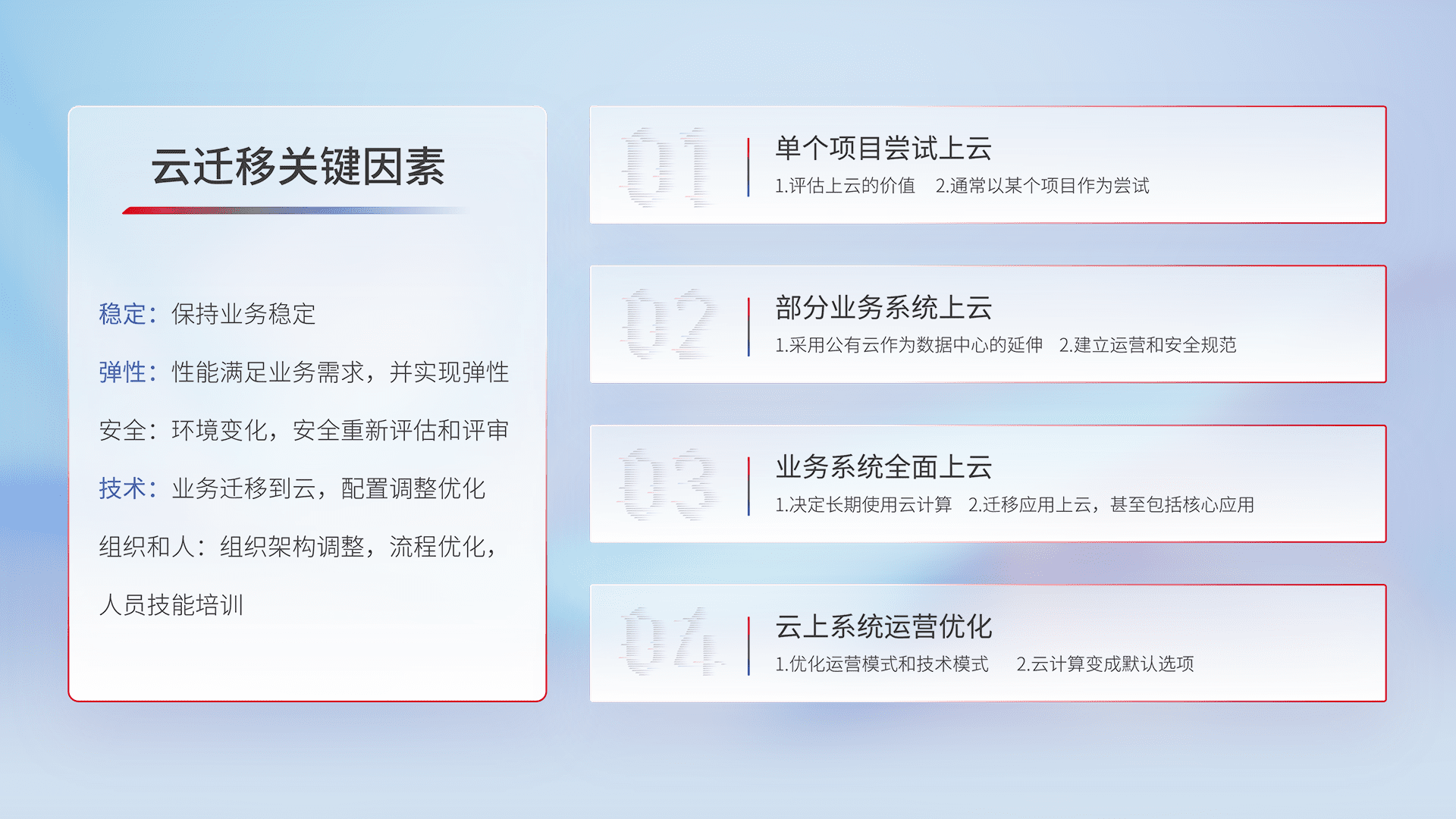结合实际业务,,,,从规划设计、、、、云平台选型、、、、云原生改造、、、、数据迁移、、集成交付,,,迁移全过程为客户识别最佳上云路径,,,,做好风险识别管理,,,,设计网络架构、、身份权限、、、、安全审计合规、、操作审计、、、、日志审计、、、、监控告警策略、、、、多站点容灾设计等,,,对云上基础设施进行整体规划,,提升IT治理水平,,,以满足弹性、、、高可用、、高性能的需求。。。。